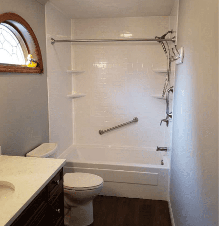 This week’s featured project is a complete bathroom remodel and install for a customer in Whitesboro, NY. Our customer decided to update her bathroom and make the bathroom area brighter. The bathroom remodel included a white Bentley tub with a white subway tile wall system and white ceiling panels. Two grab bars, a curved shower rod, both in brushed nickel and four single shelves were also installed.