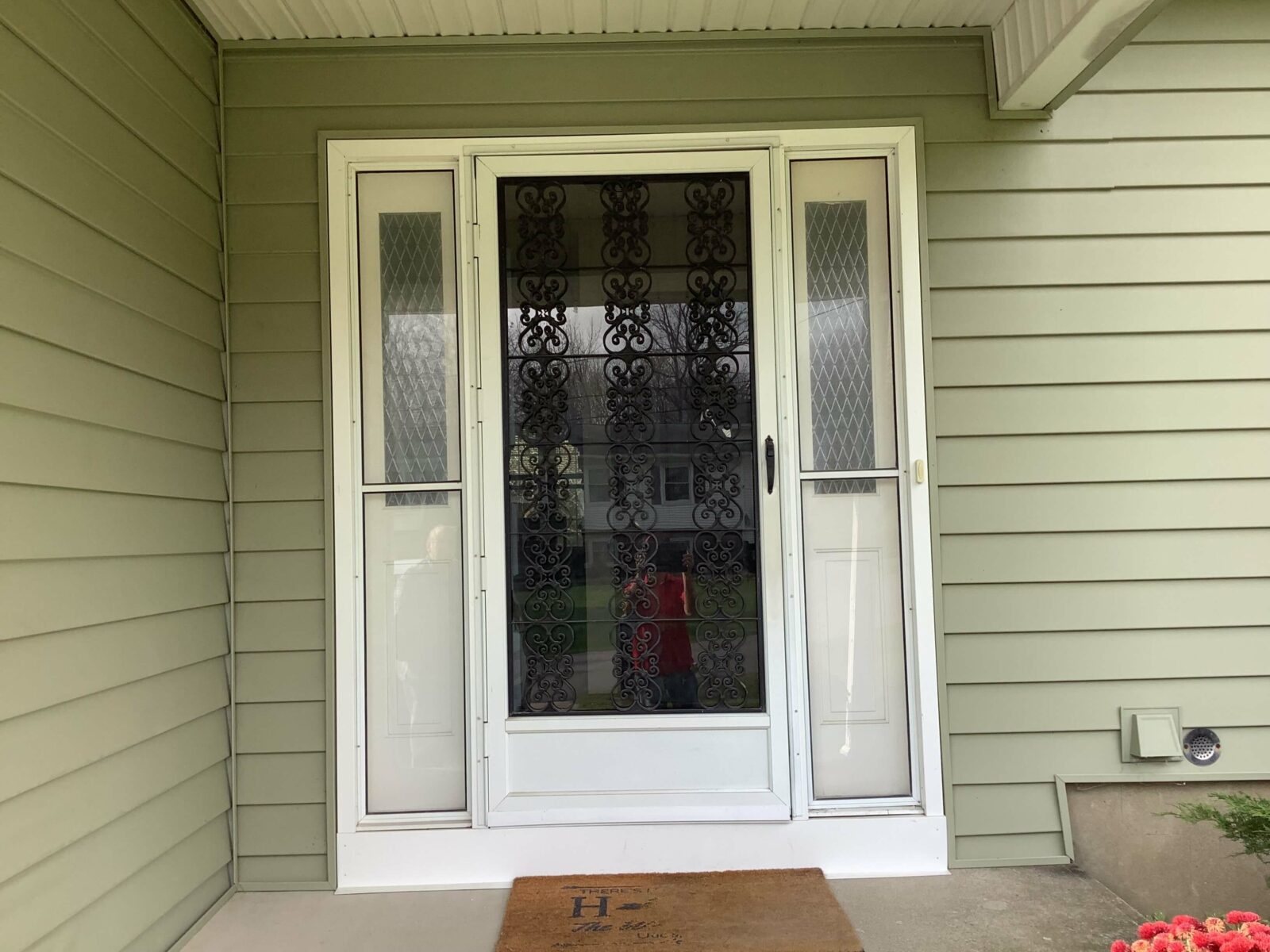 As this week’s featured project we are taking a look at a door project we recently completed for a returning customer in Deerfield, NY. When our customer was ready to replace their entry and sliding glass door, they gave us a call to help! We installed a beautiful four-panel smooth steel entry door in the color chateau, complete with 14″ sidelights with privacy glass, antique brass hardware and contoured internal grids. To complement the new entry door we installed a storm door in the color chateau with antique brass hardware.