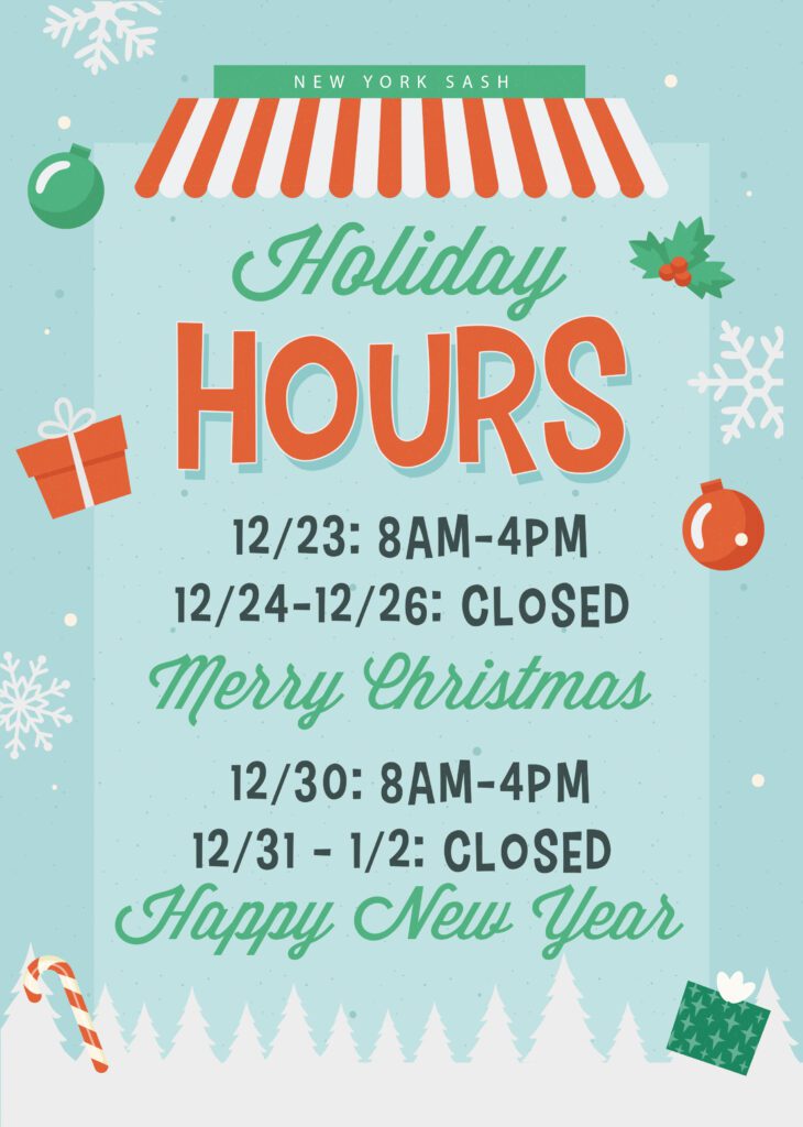 Please note our revised hours for the upcoming holidays. A Merry Christmas and Happy New Year from our family to yours! Category: Company NewsDecember 20, 2022 Share this post Share on FacebookShare on Facebook Share on XShare on X Pin itShare on Pinterest Share on LinkedInShare on LinkedIn Post navigationPreviousPrevious post:Featured: Energy Efficient Window UpgradesNextNext post:Featured: New Doors, New LookRelated Posts50% Off Installation of WindowsAugust 24, 2025Understanding Your Home Improvement FinancingAugust 19, 20253 Reasons To Finance Your Next Home Remodeling ProjectAugust 13, 20255 Reasons To Replace Your Home’s Entry DoorJuly 30, 2025Shower for a Soldier Nominations Now Open!July 25, 2025Summer Window & Door Inspection TipsJuly 9, 2025
