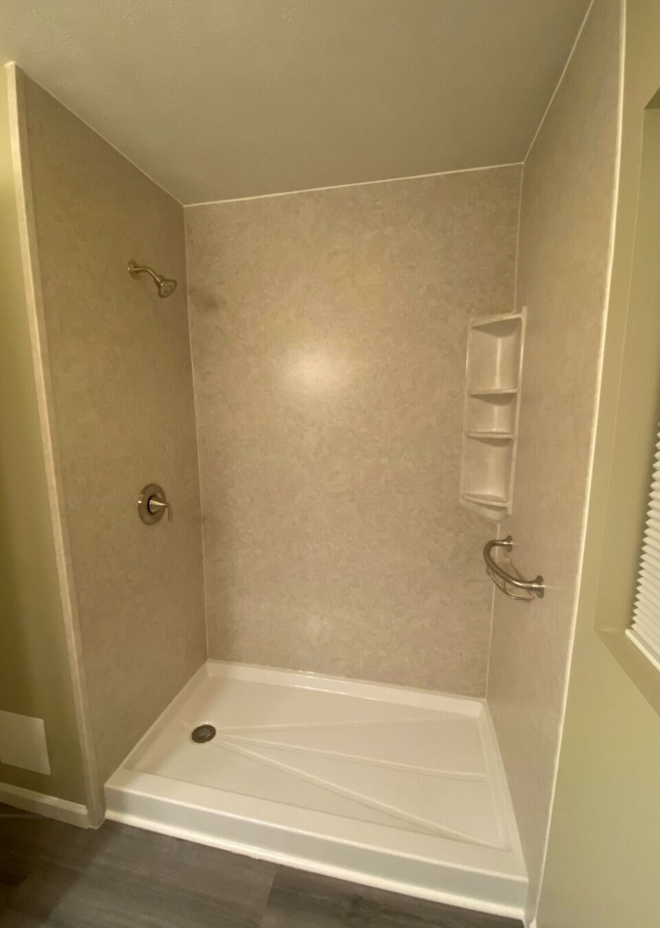 As this week’s featured project we are taking a look at a tub to shower conversion we completed for a returning customer in Canastota, NY. Our customer was ready to upgrade her bath and we were happy to help make it happen. We installed a white shower base with a new wall surround in silver…
