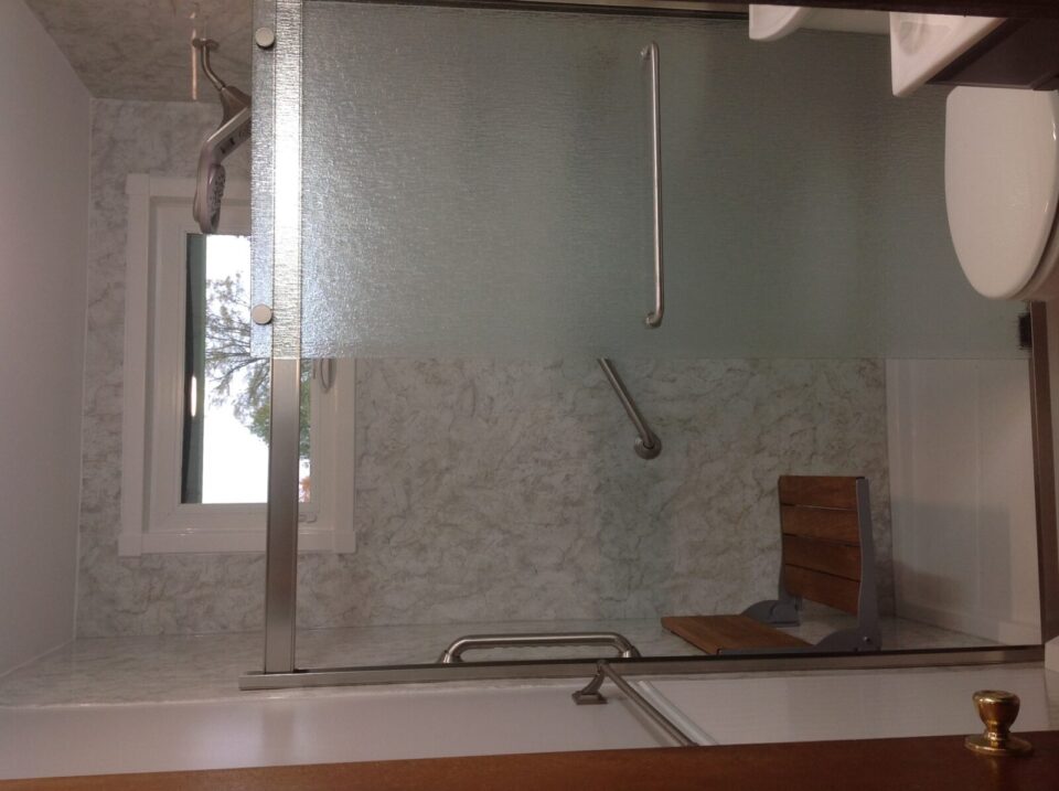 This week as our featured project, we converted a tub into a walk in shower for a New York Sash customer. We tore out their old tub & surround and replaced it with a platinum grey shower base & Champagne Travertine Shower surrounds. We added a hand held shower handle, a 16′ inch grab bar, & a shower seat for accessibility. To complete the shower, we installed all new chrome Vazia fixtures with a 3 shelf corner caddy. Our customer provided new flooring, lighting & a vanity/sink for us to install as well!