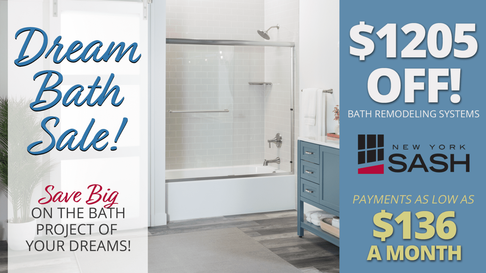 It’s time to get rid of that outdated, peeling, dirty old tub. New York Sash can help you get the bathroom of your dreams with our bathroom remodeling solutions! And during our Dream Bath Sale you can save $1205 off a new bath remodeling system!*