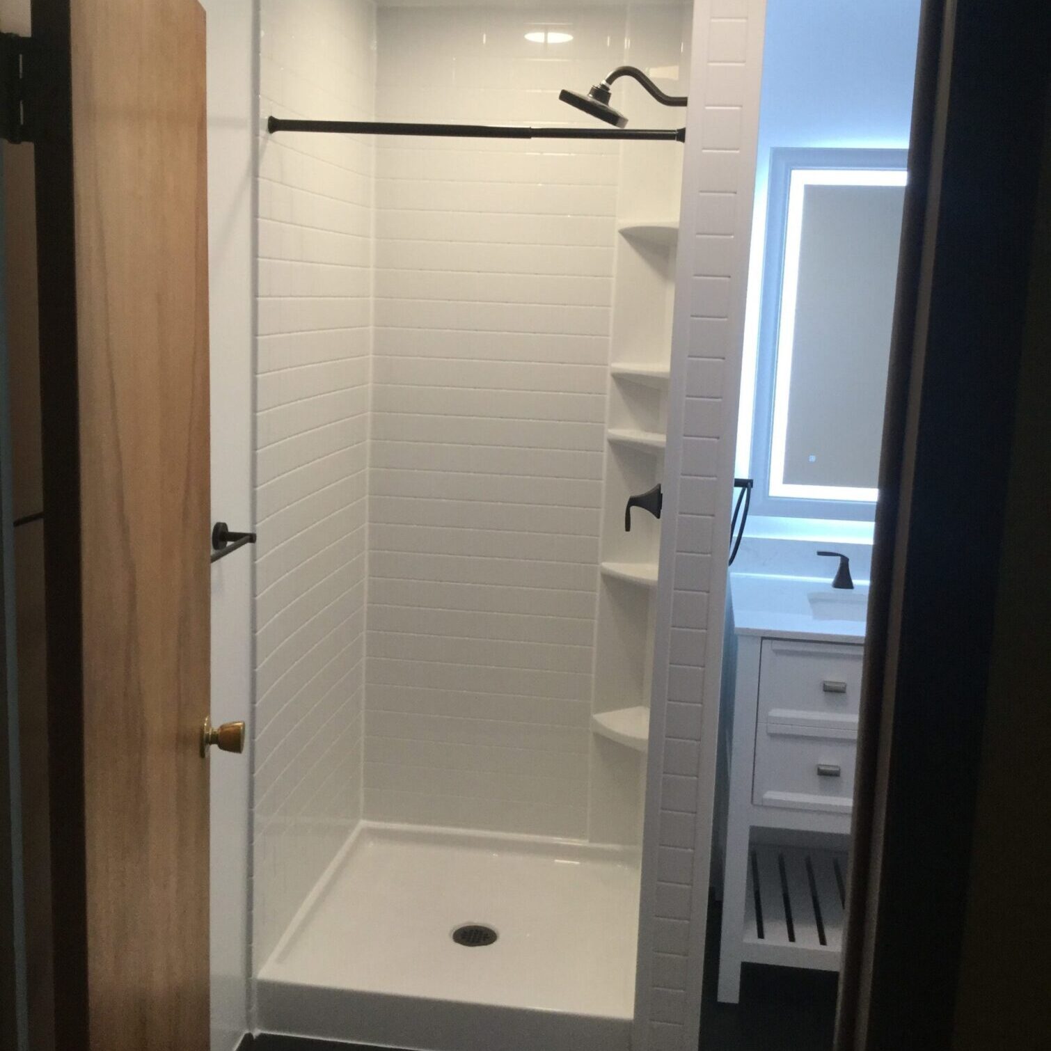 Shaving stands also make daily routines easier and safer by adding a secure area to place your foot. Like our other built-in accessories, they come in a variety of colors and patterns to perfectly match any of our bath or shower solutions. Our customers decided to have a four shelf caddy installed with a shaving stand built in at the bottom for easier accessibility.