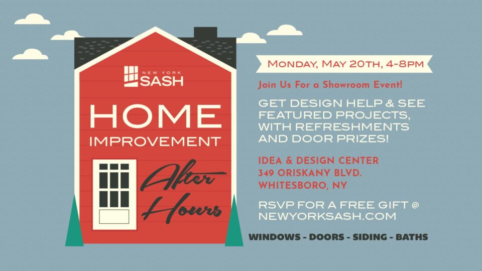 [TS_VCSC_Facebook_Video facebook_video=”https://www.facebook.com/cnyopenhouse/videos/179816536278156/”] Come out to New York Sash on Monday May 20th from 4 to 8pm for a special Home Improvement After Hours event! We will be highlighting products and services in our state of the art Idea & Design Center. Windows, doors, siding, bath and gutters – see them all on display. Get free…
