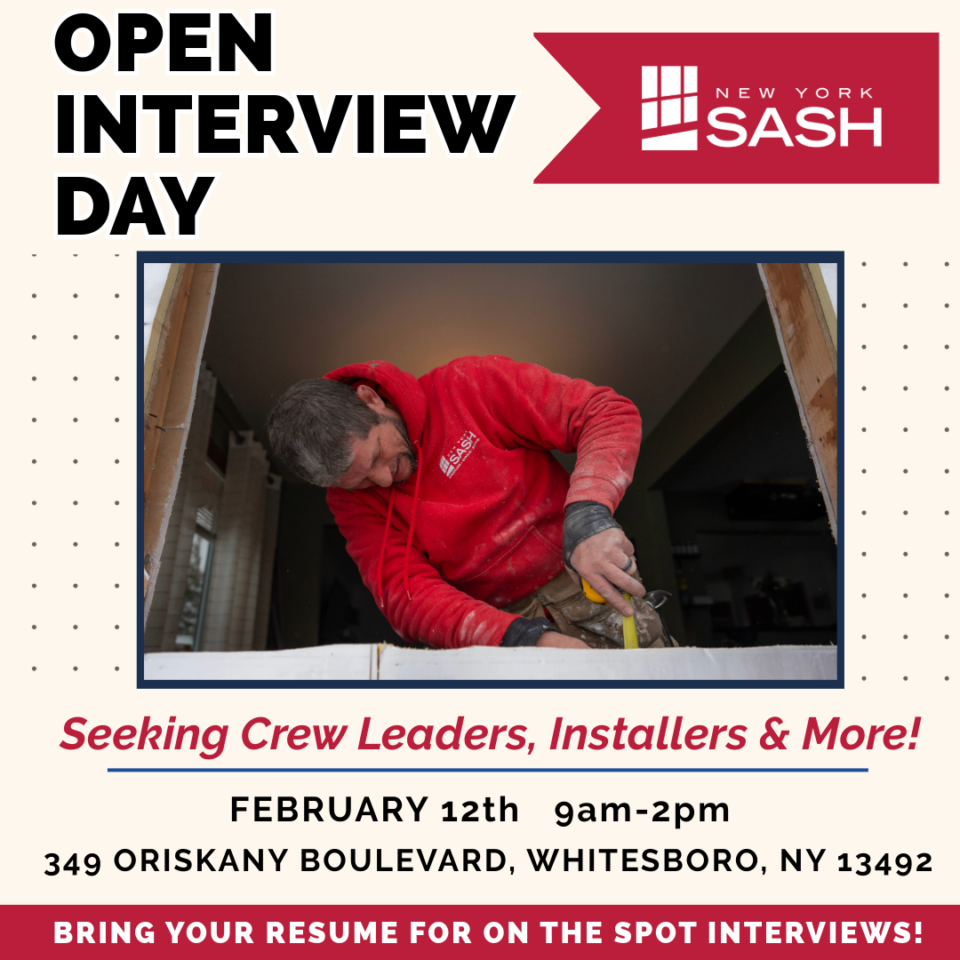 Join Us On Open Interview Day Attention job seekers, New York Sash is hiring! We are looking to add talented and hardworking individuals to our growing installation department. If you’re looking to advance your skills or put your years of experience to work, we want to hear from you. Join us for our first ever…